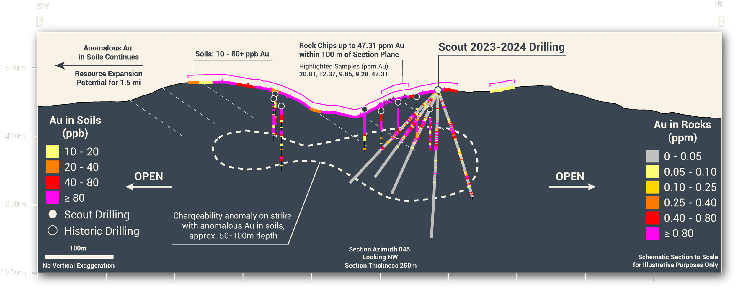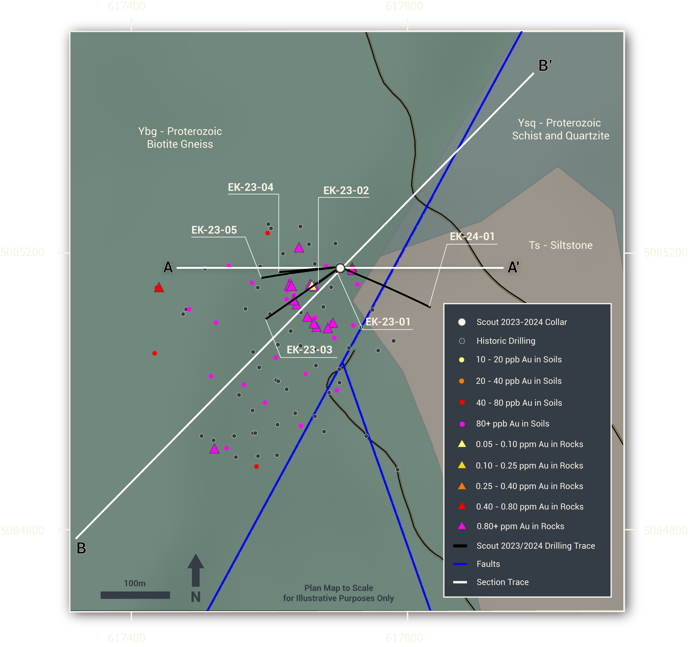 Drilling by Scout in 2023 and 2024 yielded intercepts of 100.6m @ 1.18 g/t Au (EK-23-05) and 98.18m @ 0.65 g/t Au, including 28.78m @ 1.43 g/t Au (EK-24-01)